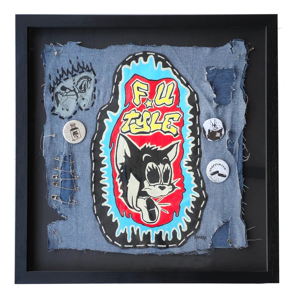 Denim, hand painted leather patch, safety pins, and badges.